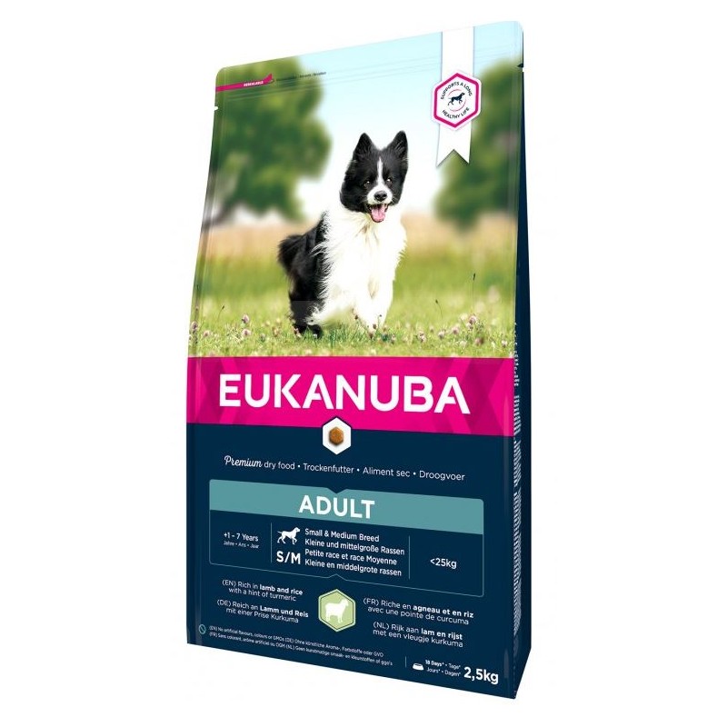 Alimentació per gossos adults de raça petita i mitjana amb xai i arròs.