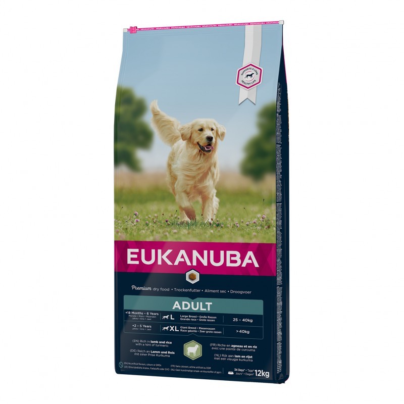 Alimentació per gossos adults de raça gran amb xai i arròs.