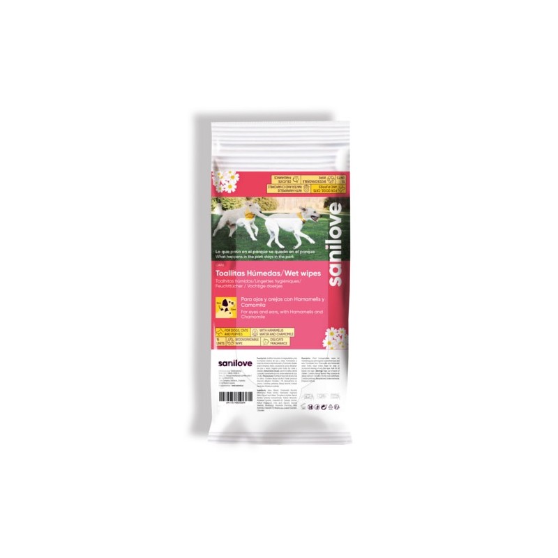 Tovalloletes humides Sanicat per la higiene diària d'ulls i orelles en mascotes que prevé la formació de lleganyes, conjuntivitis i otitis. Conté 24 unitats.