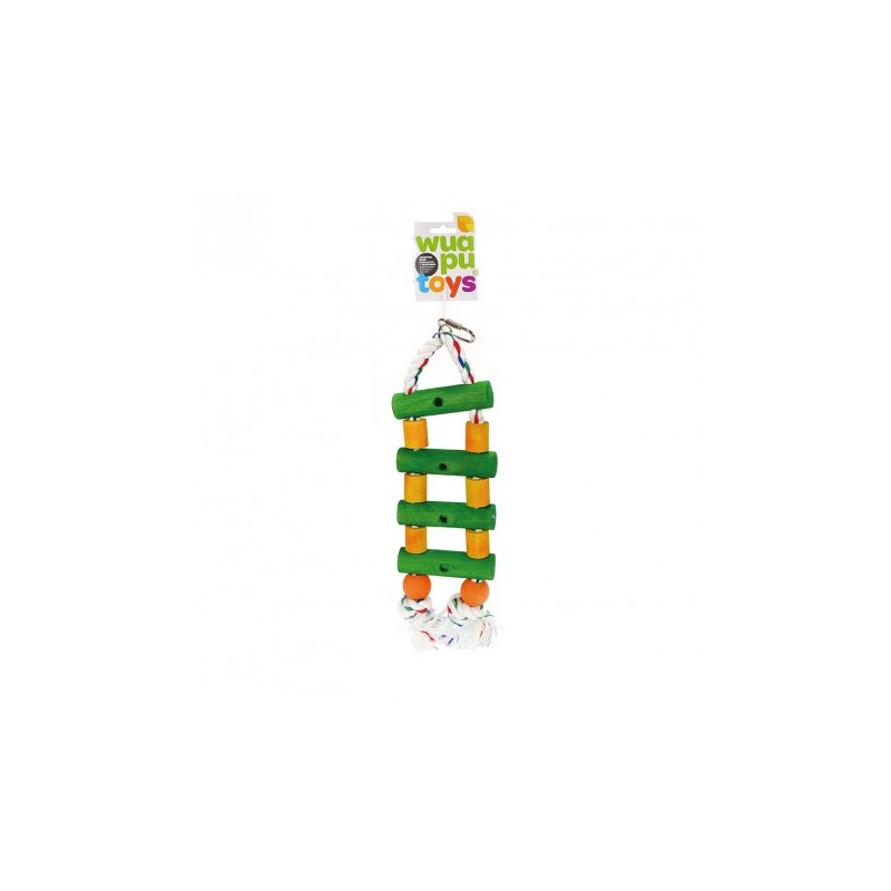 Juguet per cotorres de dos columnes de corda de cotó revestit amb fusta i amb un mosquetó per poder penjar de la gàbia.