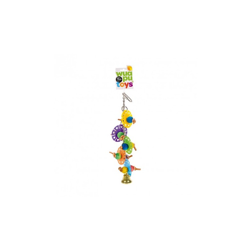 Corda amb juguets de diferents mides i textures ideal per estimular l'activitat de les cotorres.
