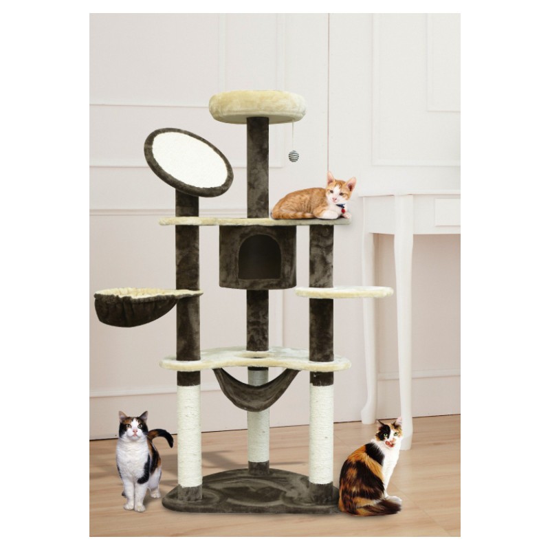 Rascador per gats de 153x65x50 cm de color marró i crema amb hamaca, caseta, plataforma i juguets.