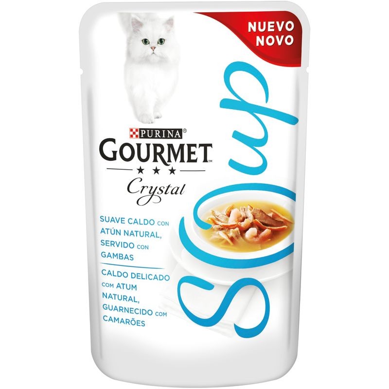 Noves sopes de 40gr Gourmet Cristal de tonyina amb gambes per tot tipus de gats