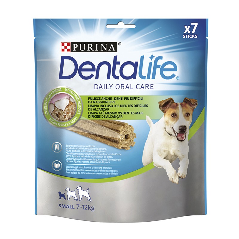 Bossa de 7 snacks dentals per gossos de raça petita entre 7 i 12 kg de pes que ajuda a netejar les dents i el sarro acumulat.