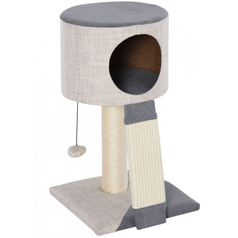 Rascador estret molt elegant de color gris amb caseta i rampa.