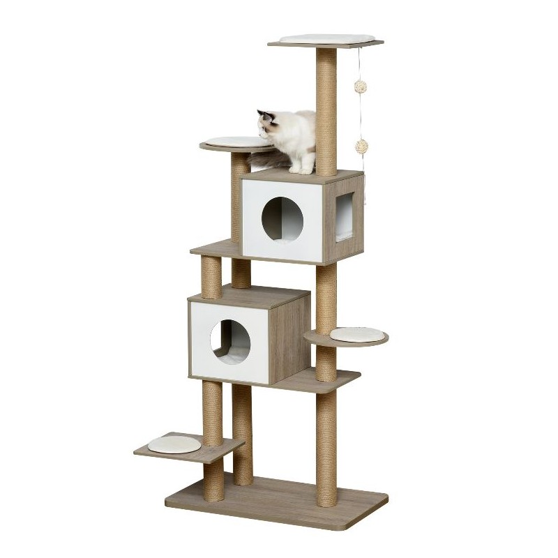 Rascador per gats de menys de 5 kg de pes fabricat de fusta amb columnes de yute.