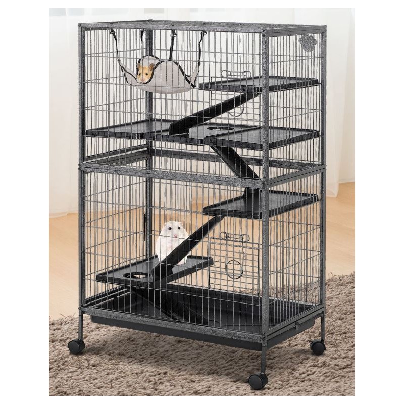 Gàbia ideal per conills, cobayes o hurons fabricada de metall de color gris amb rodes.