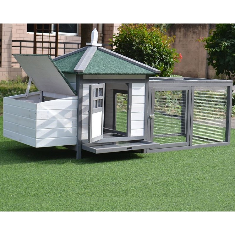 Galliner d'exterior fabricat de fusta d'avet en color gris i verd.