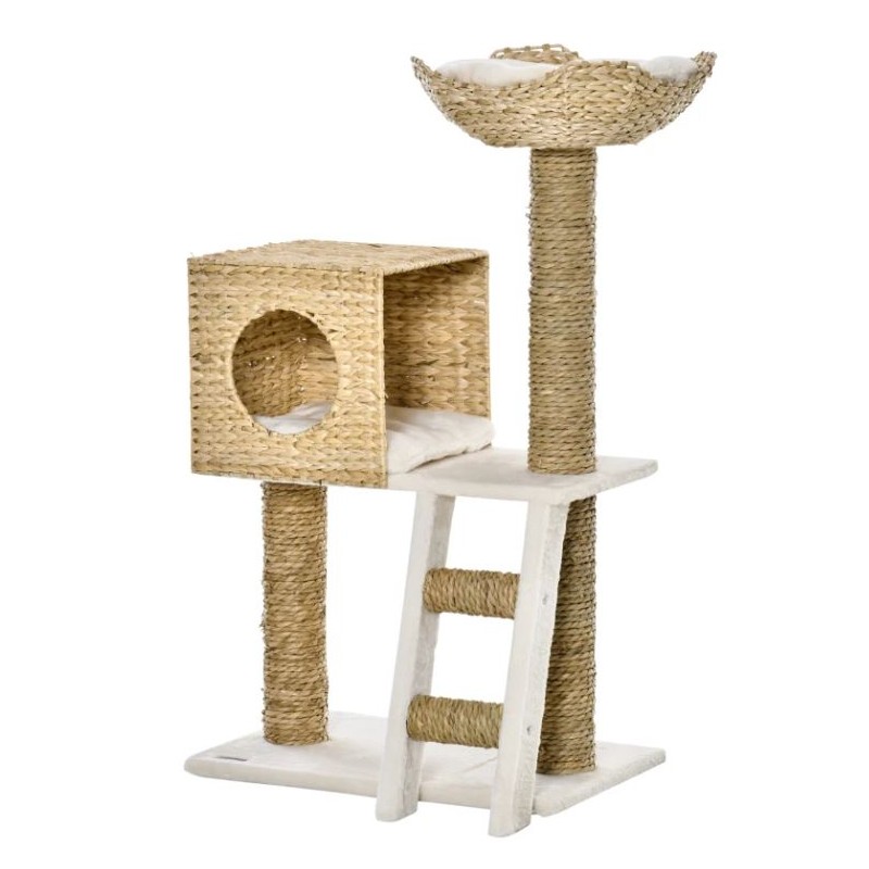 Rascador amb columnes de corda de totora, caseta i cuna per gats.