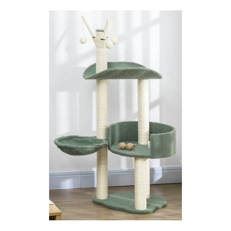 Rascador per gats de color verd i crema amb plataformes i juguets penjant.