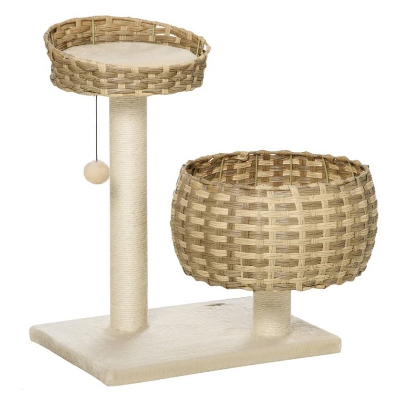 Rascador per gats fabricat de mimbre sintètic amb dues cunes i columna per rascar.