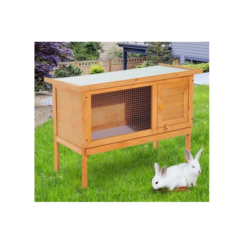 Conillera d'exterior fabricada de fusta d'avet amb sostre abatible i bandeja extraíble.
