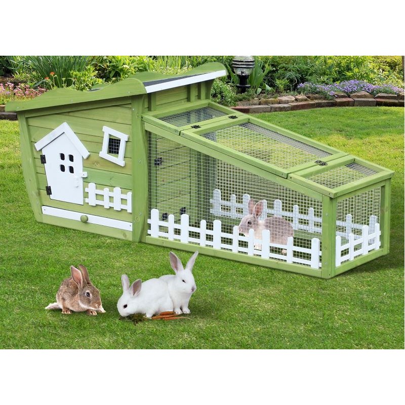 Conillera d'exterior fabricada de fusta d'avet color verd amb sostre asfàltic.