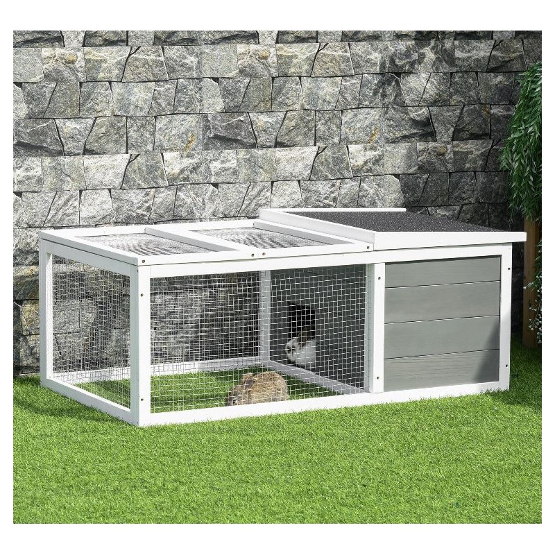 Gàbia d'exterior per conills o cobayes fabricat de fusta d'avet color gris.