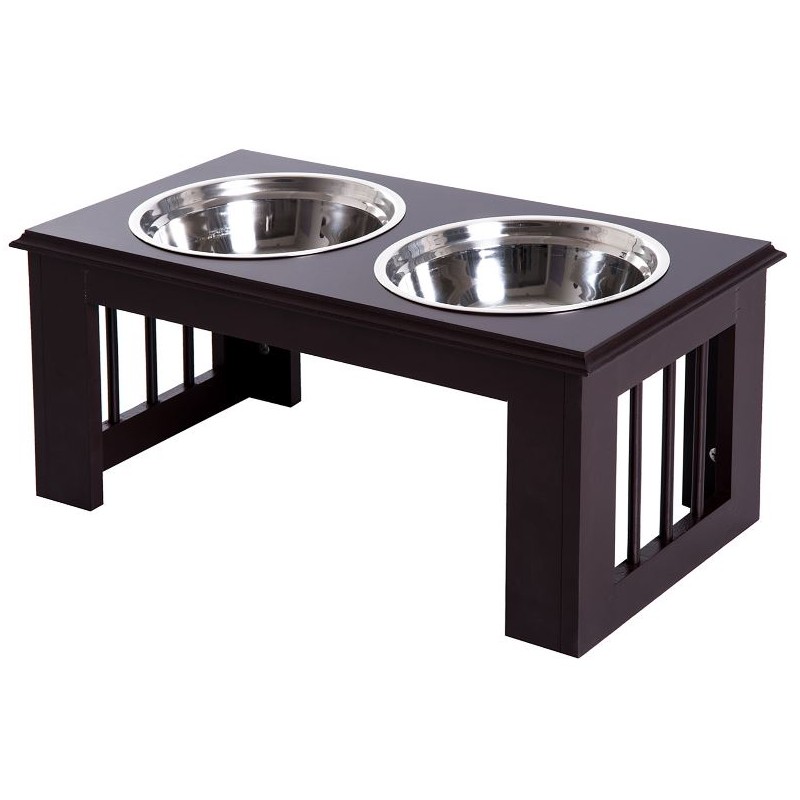 Menjadors elevats fabricats de fusta negre amb bols d'acer inox extraíbles.