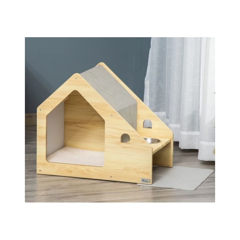 Caseta per gossos petits fabricada d'aglomerat de fusta per interior amb menjadors integrats.