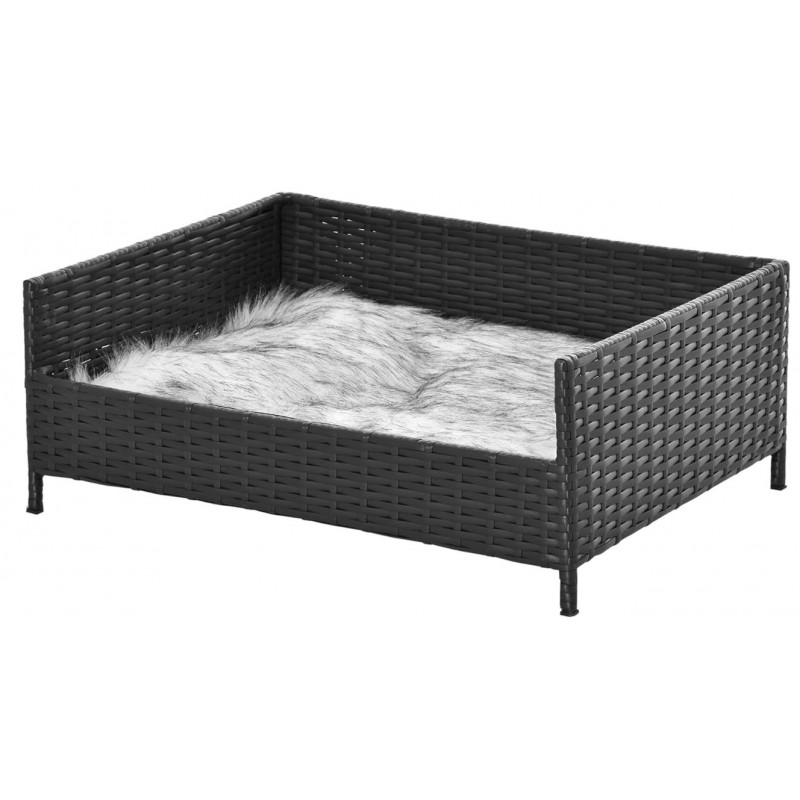 Llit per gossos fabricat de ratán sintètic de color negre amb potes elevades.