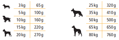 Recomendaciones de alimentación: Peso del perro adulto • Cantidad recomendada por animal y día en gramos