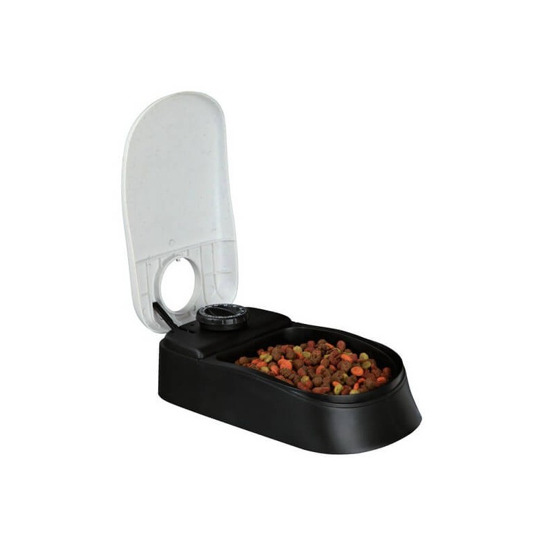 Dispensador automático de alimentos para gatos y perros. Capacidad 300 ml con temporizador de máximo 48h. Apto para alimento húmedo ya que incorpora un pack refrigerante para mantenerlo fresco. Funciona con pilas (no incluidas) autodeslizante u fácil de limpiar. Medidas: 13x7x24 cm.