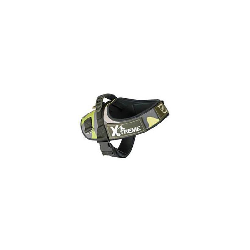 Arnés ideal para todo tipo de perros. Muy fácil de ajustar, con estampado verde de camuflaje y asa de pvc en la espalda. Medidas segun dibujo A(cuello) y B (pecho)