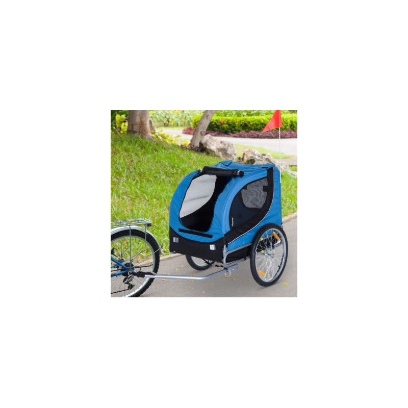 Remolque para perros con acople universal que se adapta a la mayoria de bicicletas estandard con carga máxima de 25 kg. Equipado con ventilación y seguridad para tu mascota. Medidas: 130x90x110 cm.