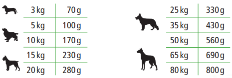 Ingredientes: Arroz; Harina de carne de ave con bajo contenido en cenizas (18%); Harina forrajera de avena (17,5%); Fécula de patata; Salvado de avena; Harina de arenque (2,5%); Harina de huesos de uva; Levadura de cerveza, secada; Pulpa de remolacha seca, desazucarada; Semillas de chía (1,5%); Grasa de ave; Aceite vegetal (palma, coco); Fosfato dicálcico; Hígado de ave, hidrolizado; Semillas de lino; Cloruro de sodio; Cloruro de potasio; Hierbas, secadas (en total 0,2%: hojas de ortiga, raíz de genciana, centaura menor, manzanilla, hinojo, alcaravea, muérdago, aquilea, hojas de zarzamora); Yucca schidigera