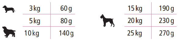 Ingredientes: Harina de carne de ave con bajo contenido en cenizas (18%); Arroz (17%); Harina forrajera de avena; Harina de carne de pato (10%); Grasa de ave; Aceite vegetal (palma, coco); Harina de arenque (5%); Hígado de ave, hidrolizado (4%); Harina de huesos de uva (2,5%); Levadura de cerveza, secada; Pulpa de remolacha seca, desazucarada; Vainas de algarroba, secas; Huevo, secado; Semillas de chía; Fosfato dicálcico; Cloruro de sodio; Cloruro de potasio; Hierbas, secadas (en total 0,2%: hojas de ortiga, raíz de genciana, centaura menor, manzanilla, hinojo, alcaravea, muérdago, aquilea, hojas de zarzamora); Yucca schidigera
