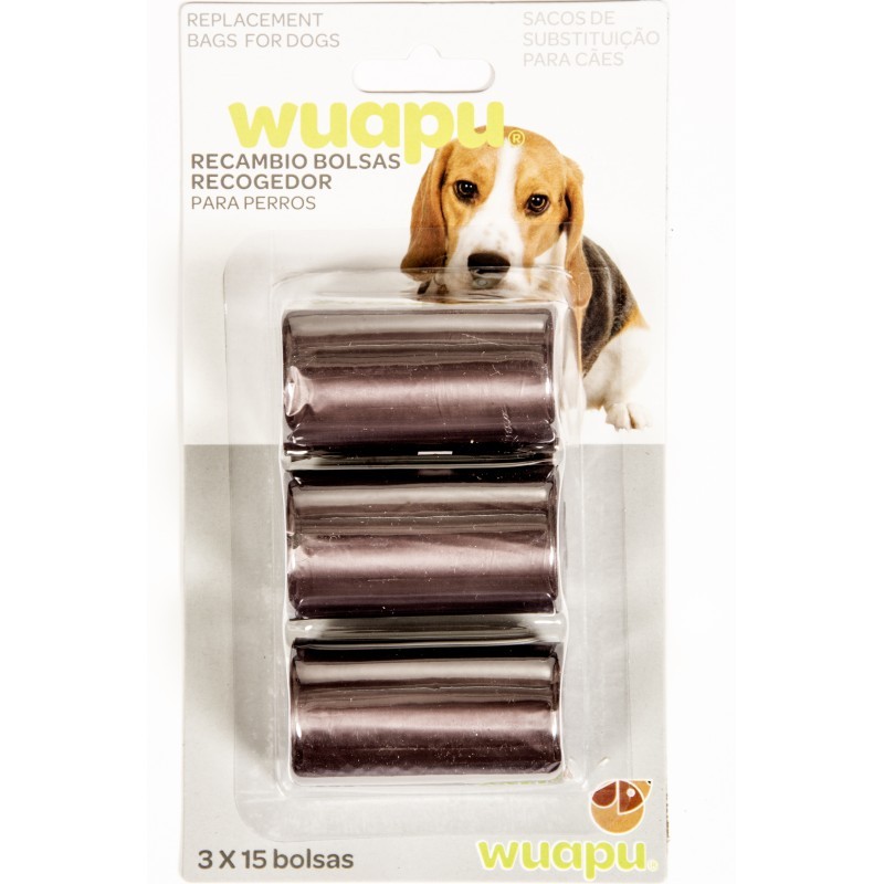 Blister con 3 rollos de 15 bolsas para recoger excrementos de gatos o perros.