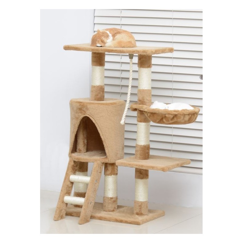 Rascador de color marrón con grande plataforma, nido y caseta.