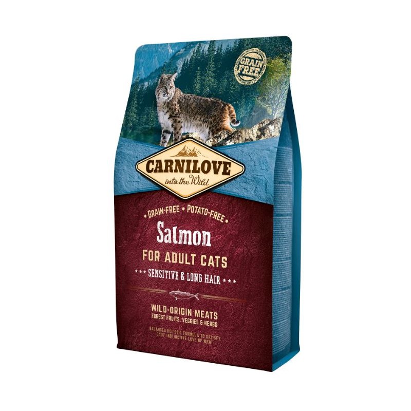 Pienso para gatos adultos con pelo largo sin cereales ni patata con salmón fresco.