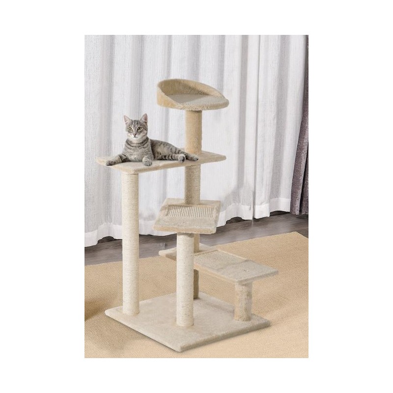 Rascador para gatos de 48 x 48 x 101 cm de color crema y con rascador en el suelo y plataforma elevada.