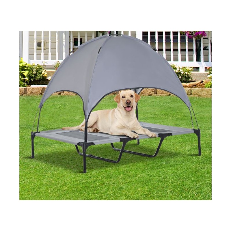 Cama elevada para interior o exterior con sombrilla extraíble y tejido transpirable de rejilla en color gris.