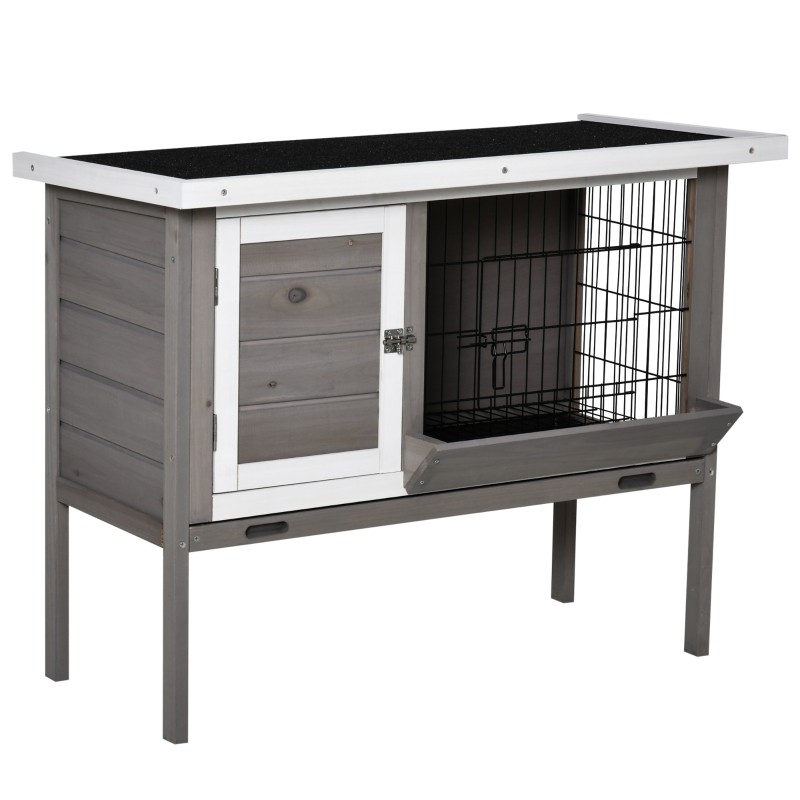 Conejera de madera de color gris con comedero.