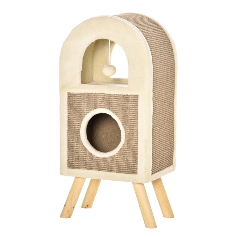 Rascador en forma arqueada con mucho espacio para rascar, cueva y juguete colgante.