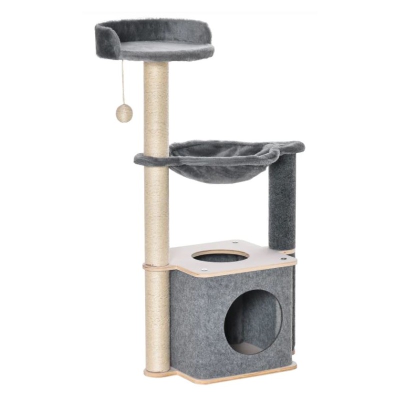 Rascador para gatos con estructura de aglomerado de madera y tela gris.