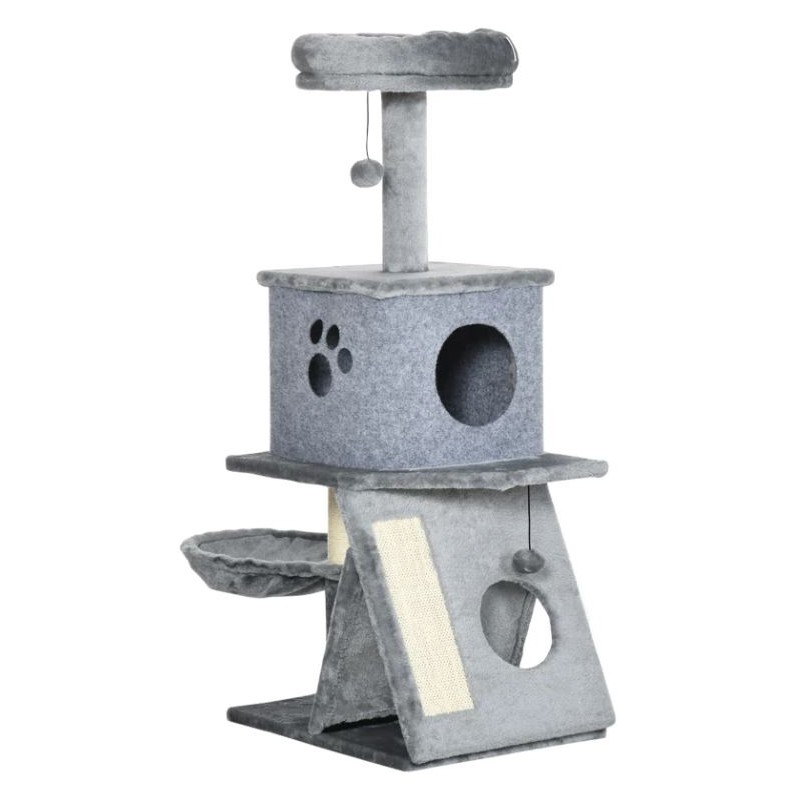 Rascador para gatos con rampa para afilar sus uñas, caseta, plataformas y hamaca colgante para descansar.