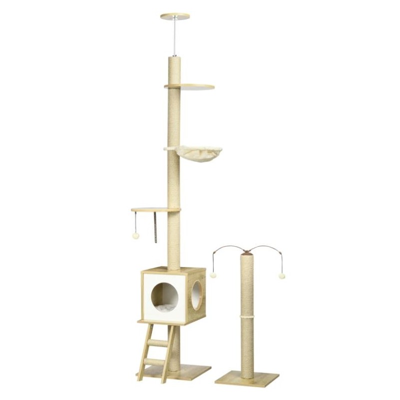 Rascador de techo con altura ajustable y rascador de tierra con juguetes.