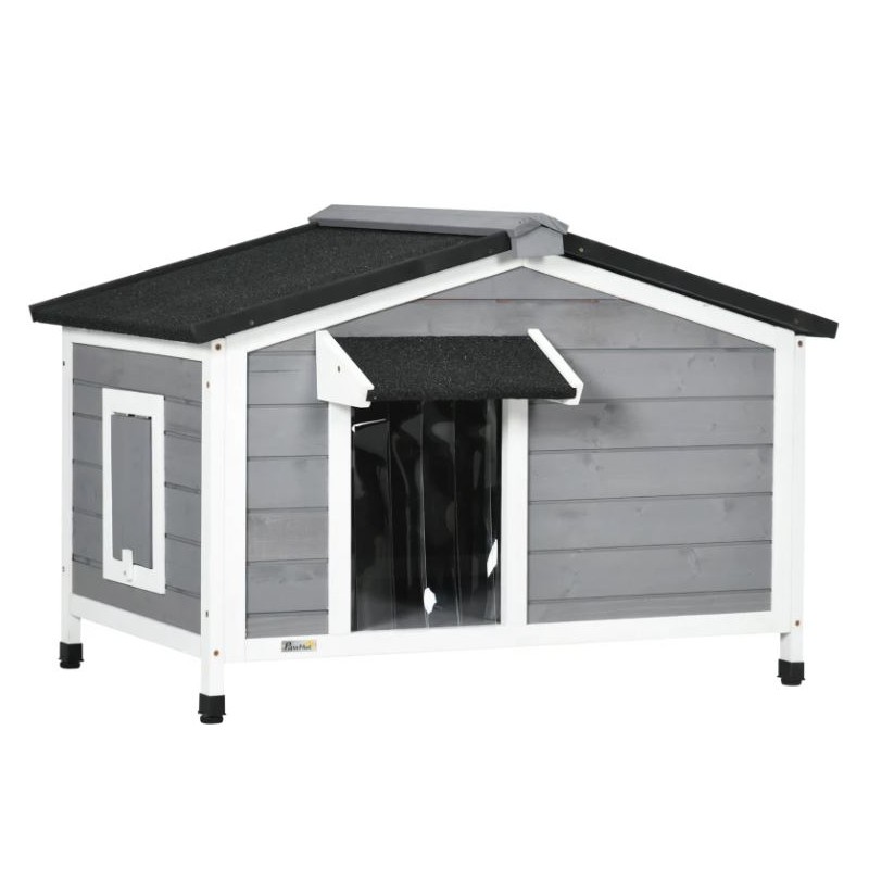 Caseta de exterior fabricada de madera de abeto de color gris con puerta con lamas y techo abatible.