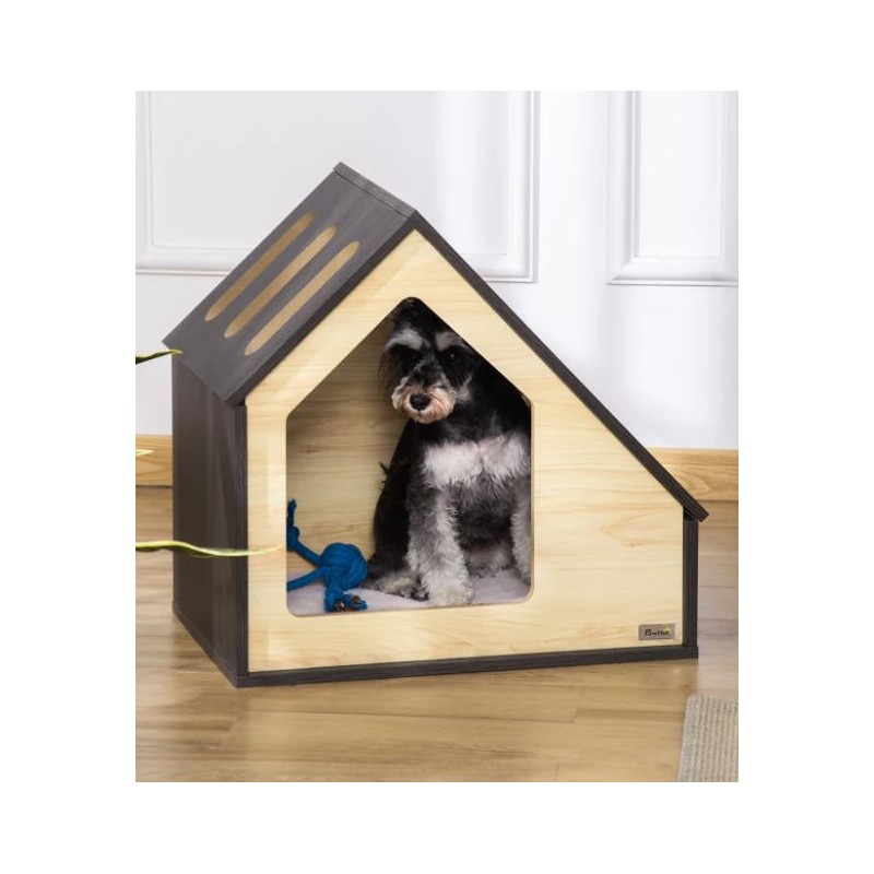Caseta para perros fabricada de aglomerado de madera para interiores.