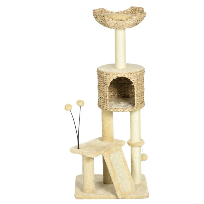 Rascador para gatos con cueva de totora, juguetes y rampa.
