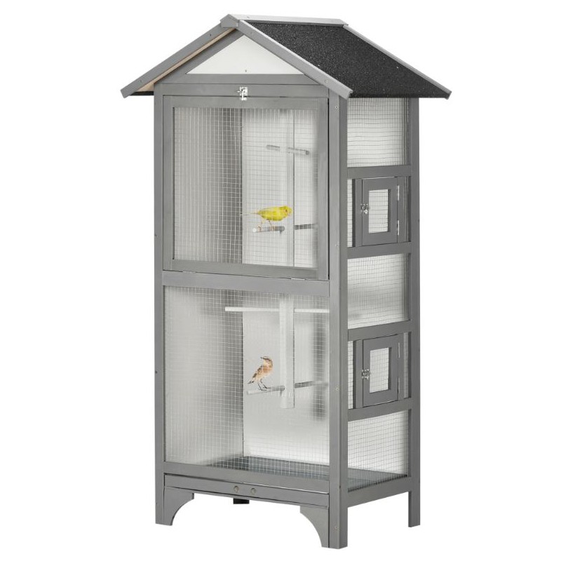 Jaula de exterior para gatos fabricada de madera de color gris.