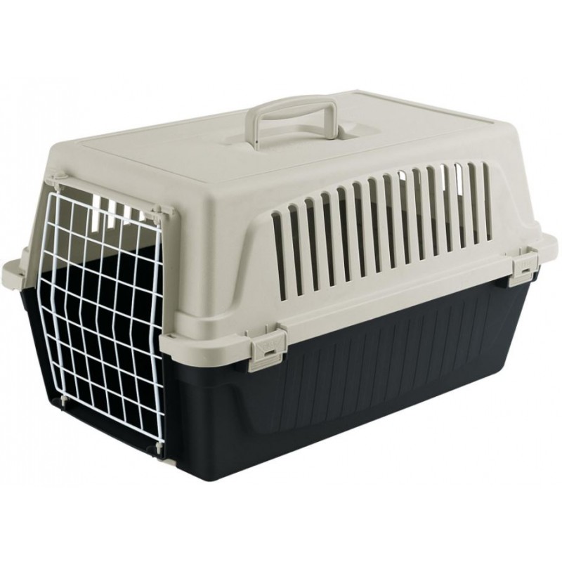 Las cajas de viaje Atlas están formadas de dos partes sujetas firmemente por los cierres laterales. Tiene una asa de plástico resistente a la parte superior para poder transportar. Con aberturas de ventilación laterales para tener aire fresco en el interior. La puerta es de acero chapada en plástico.